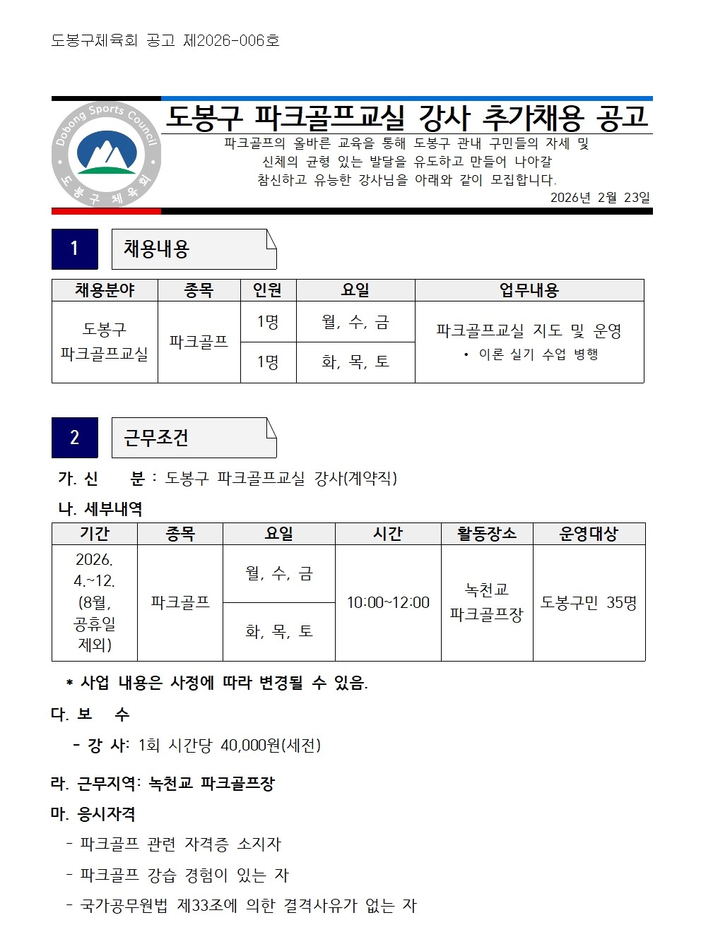 2026 도봉녹천파크골프장 관리 및 운영 지원자 추가 채용 공고