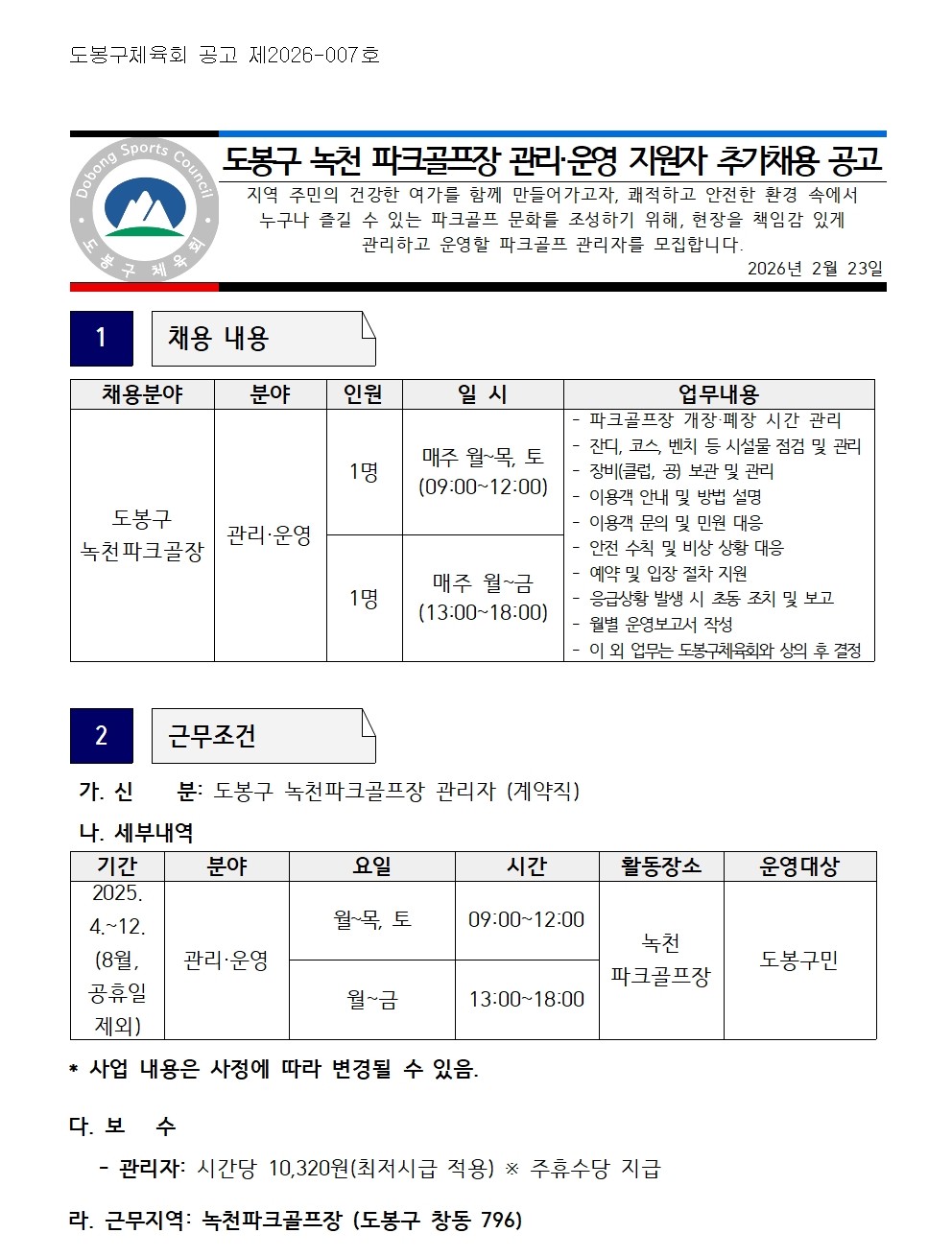 2026 도봉녹천파크골프장 관리 및 운영 지원자 추가 채용 공고