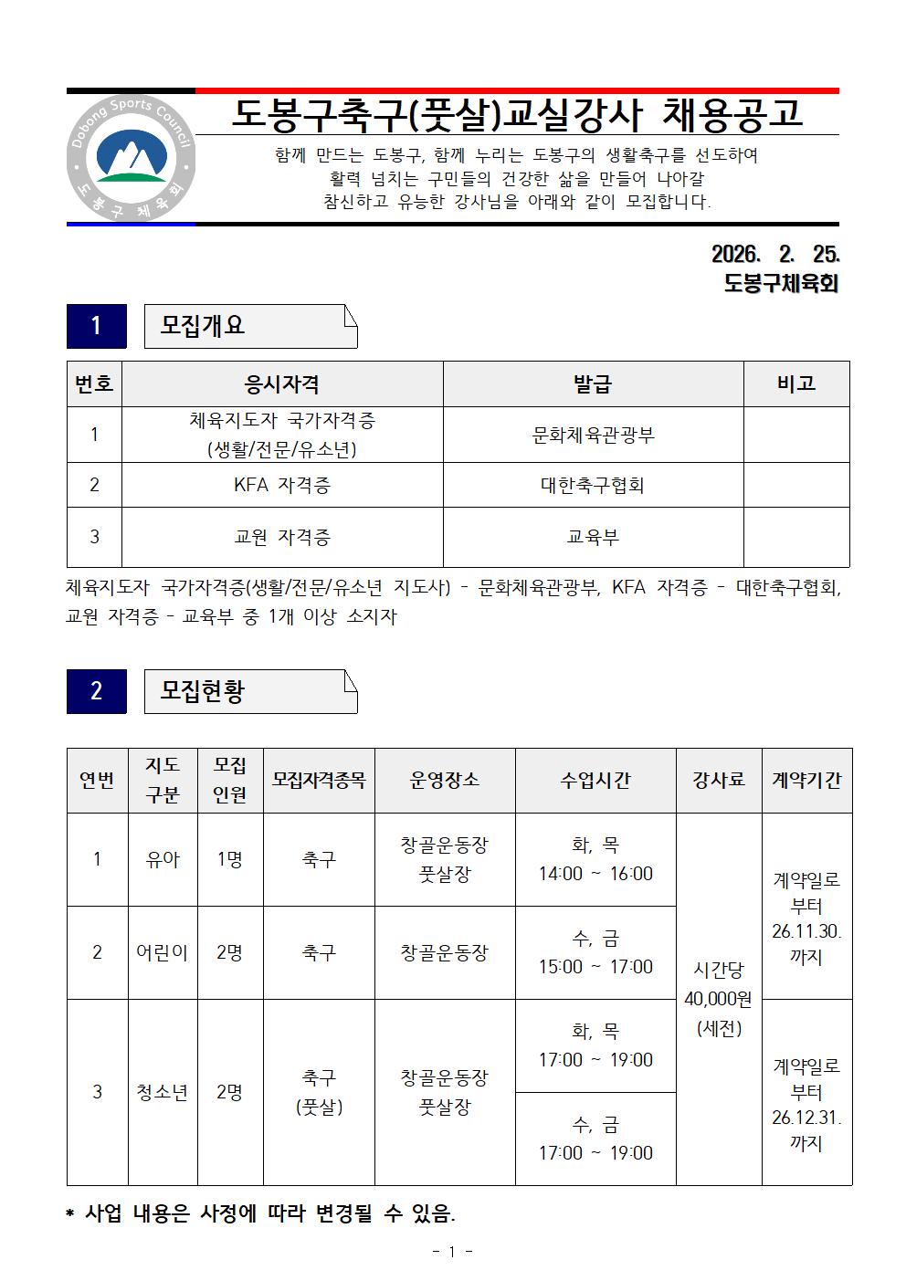 2026년 도봉구 축구(풋살)교실 강사 채용 공고
