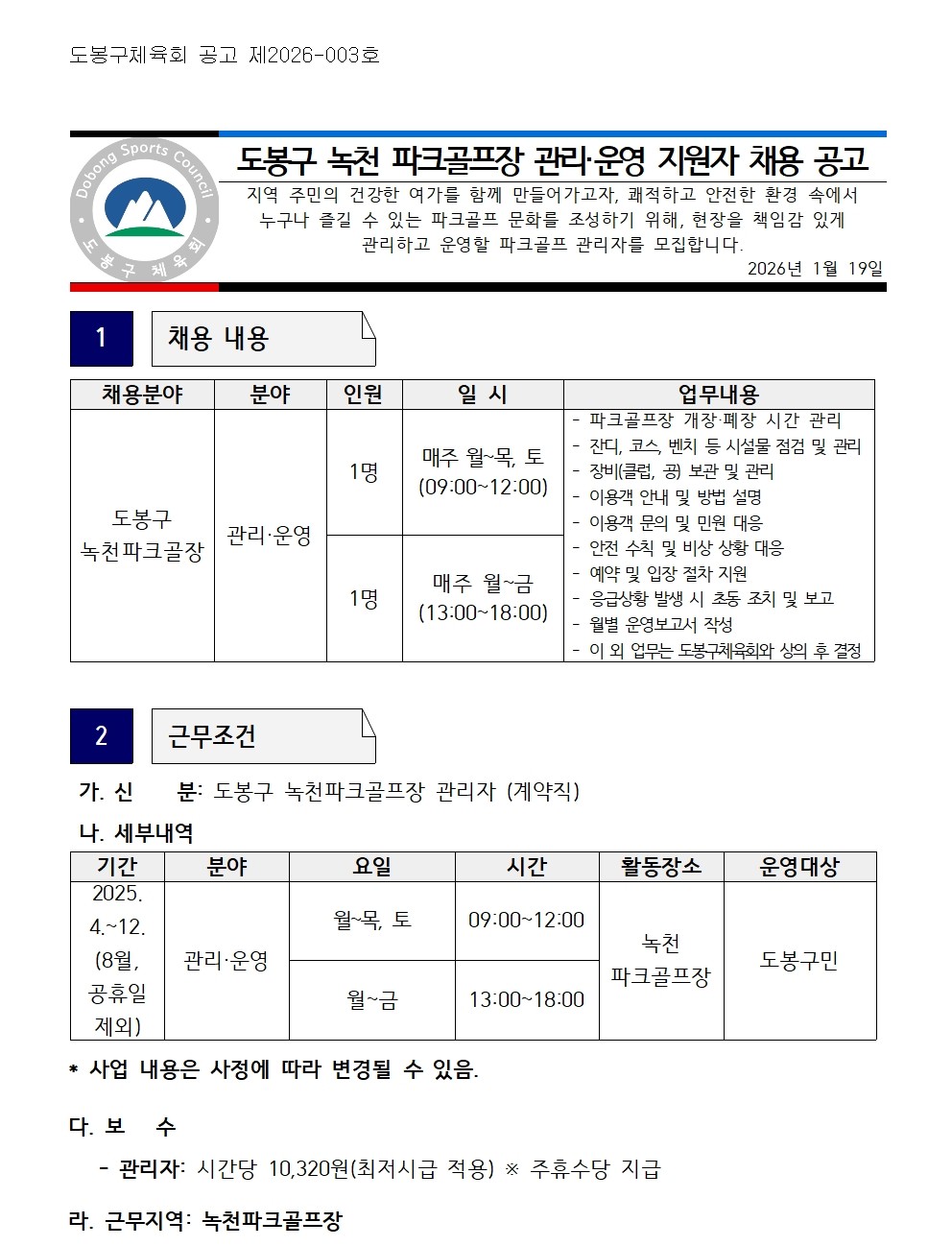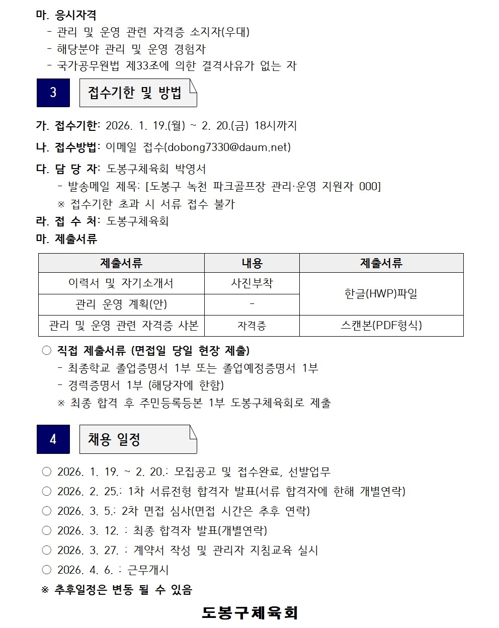 2026 도봉녹천파크골프장 관리 및 운영 지원자 채용 재공고